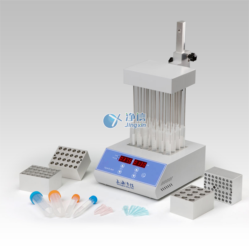 JXDC-20氮氣吹掃儀采用微電腦和PID模糊控制技術,利用鋁材料做為導熱介質,以代替傳統的水浴裝置,具有使用方便、控溫范圍大、精度高等特點。其工作原理是將氮氣或空氣連續、可控地吹到加熱樣品表面,并根據被濃縮溶劑的蒸發速度和沸點,設定加熱溫度,實現大量樣品的濃縮。